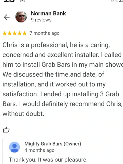 Chris at Mighty Grab Bars offers old fashioned customer service, Fast friendly scheduling, Free safety assessments, Upfront competitive pricing. I install and design custom safety grab bar solutions to fit any situation. Highly experienced in precision drilling and the professional placement of grab bars. I utilize a camera inspection tool in order to inspect for hazards inside the wall before mounting the grab bars. Thousands of grab bars successfully installed. I carry many styles and finishes on my stocked vehicle ready to install. I have experience in working with Home Owners, Physical Therapists, Home Health Agencies and More. Coconut Creek Grab Bar Installation. *See Homepage For More Info.
